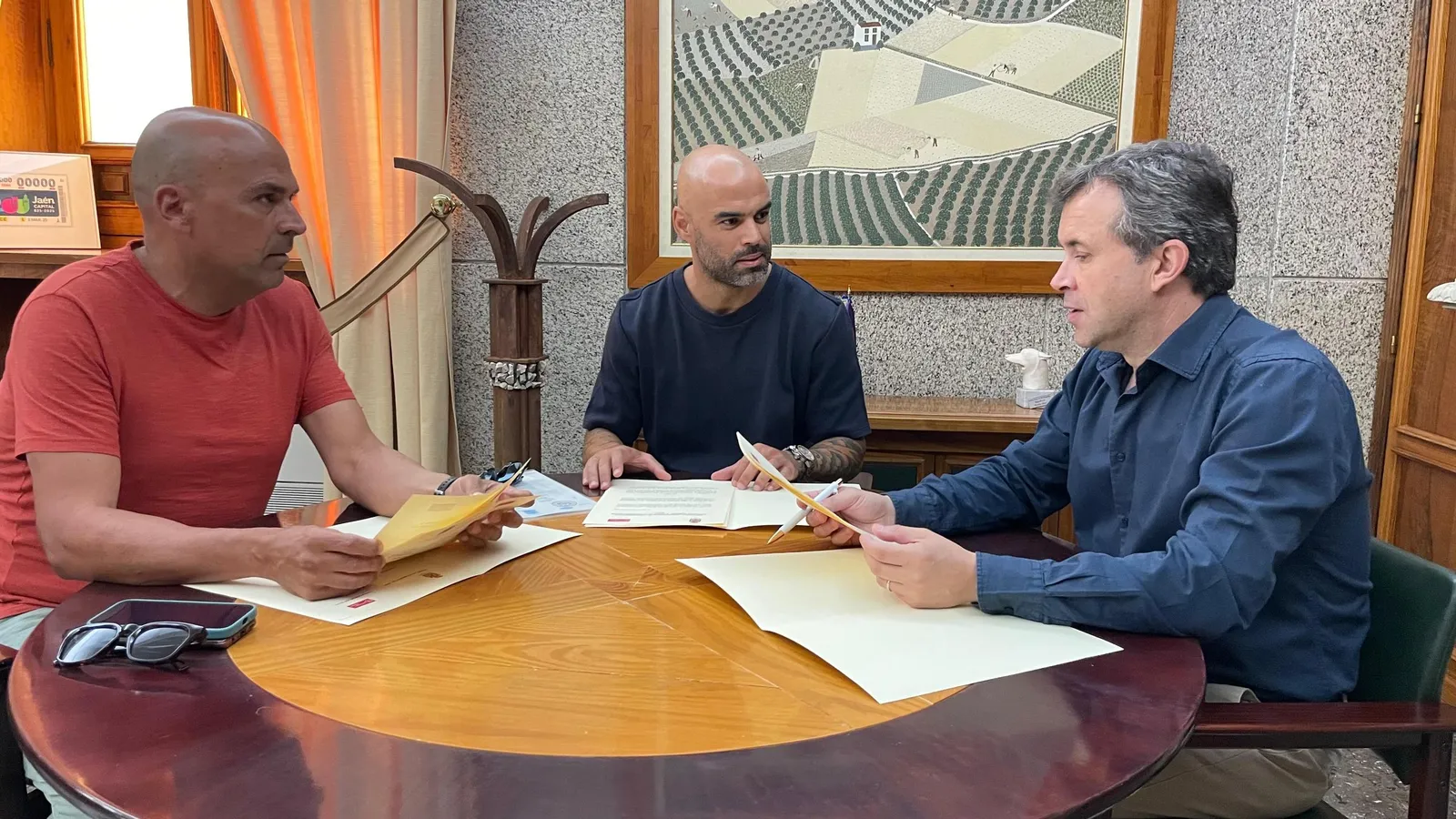La firma del acuerdo contó con la presencia del alcalde de Jaén, Julio Millán, y del concejal de Medio Ambiente y Patrimonio, José María Cano, junto a José Antonio Espín, excapitán del Real Jaén, representante de la Fundación Mejor Igual y cofundador de Cube Park Jaén Entrena.
